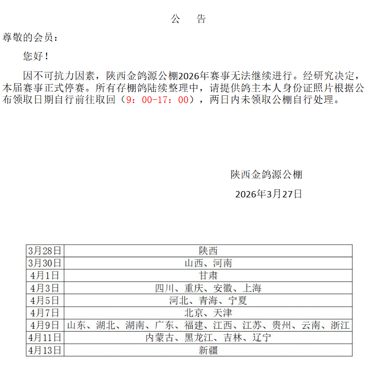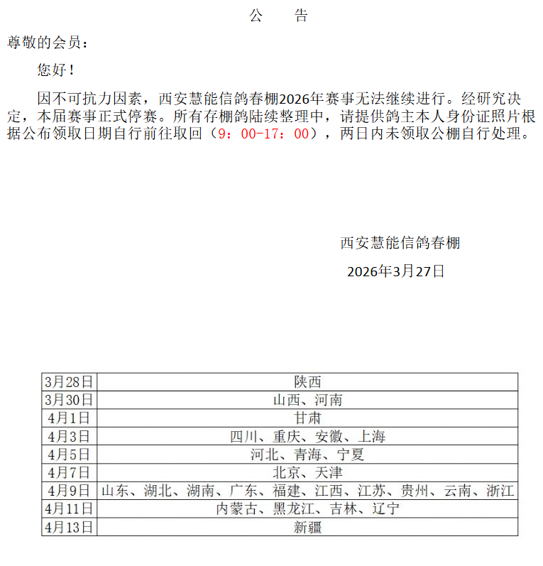 3月27日,陕西慧能金鸽源公棚、西安慧能信鸽春棚先后发布公告:因不可抗力因素,西安慧能信鸽春棚2026年赛事无法继续进行。经研究决定,本届赛事正式停赛。所有存棚鸽陆续整理中,请提供鸽主本人身份证照片根据公布领取日期自行前往取回(9:00-17:00),两日内未领取公棚自行处理。