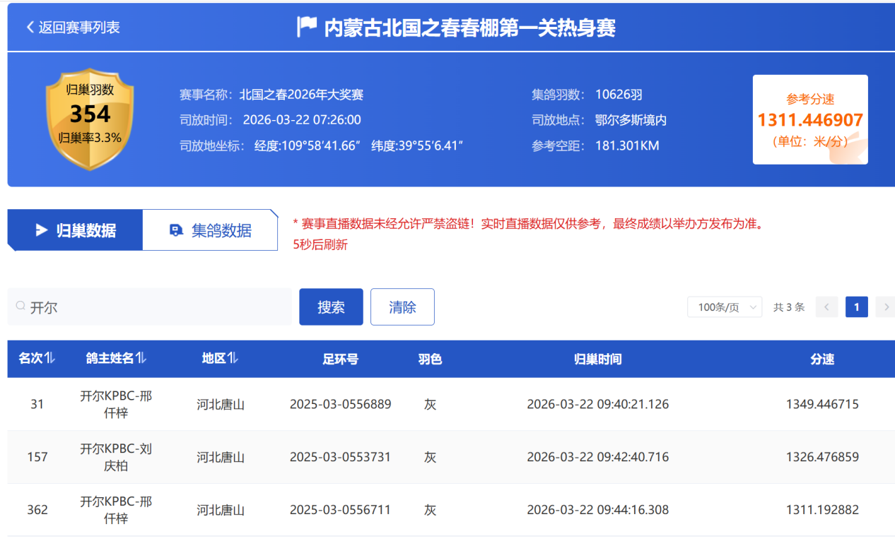 在3月22日举办的北国之春公棚首关比赛上,开尔的盖比、魔法两大黄金家族,斩获了31名、157名、362名等好成绩。