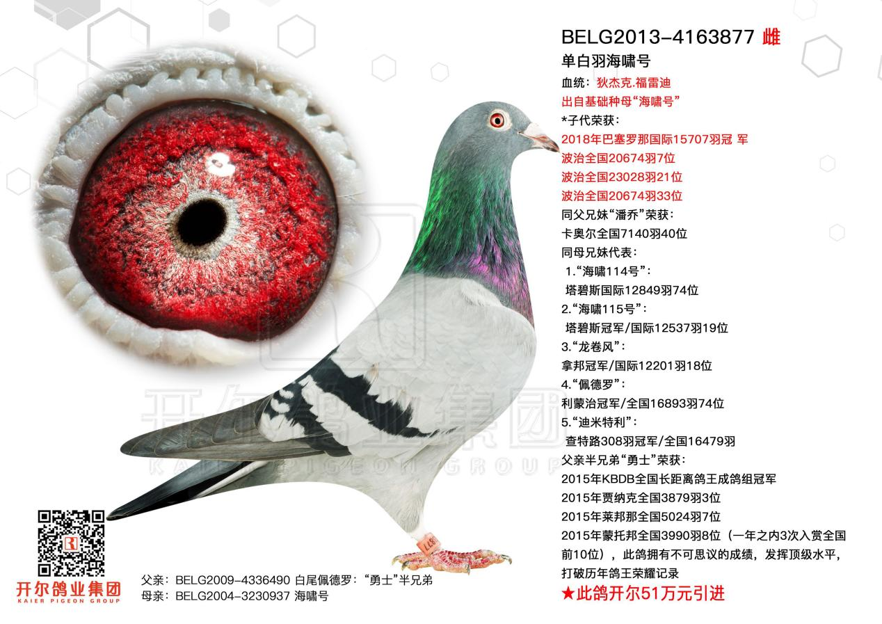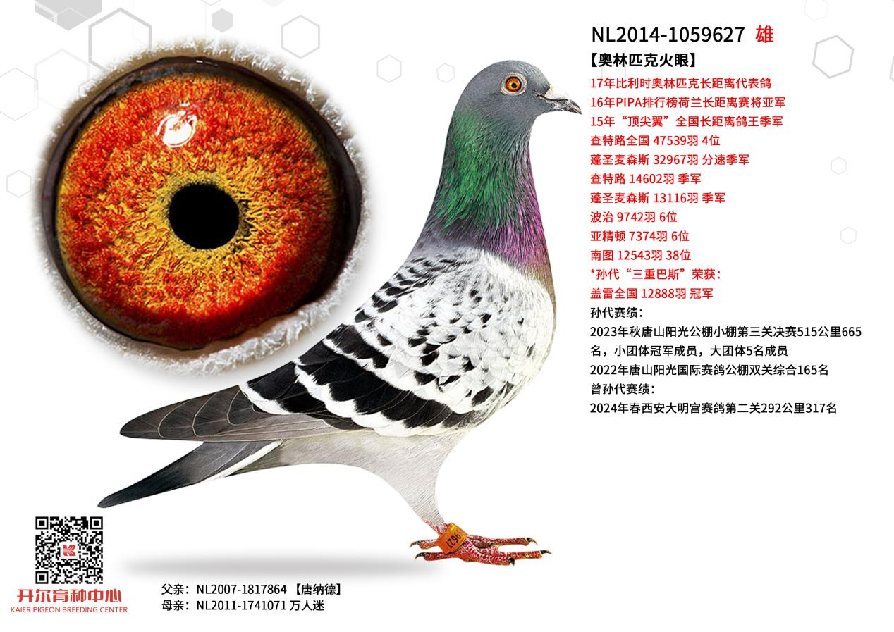 157名父亲源自开尔魔法家族明星种鸽奥林匹克火眼,同时融入20年开尔大棚四关鸽王冠军的优质血脉。奥林匹克火眼,本身斩获17年比利时奥林匹克长距离国际鸽王,其母亲是开尔魔法家族始祖配对魔幻爱神与幸存者的直女,血统底蕴深厚,遗传稳定出众。