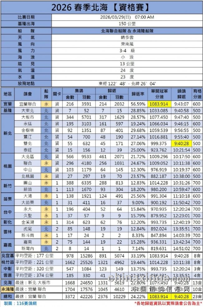 3月29日早7点,台湾北海春季资格赛在基隆港出海150公里处开笼放飞。多家鸽会合计上笼3372舍42226羽赛鸽。其中,宜兰、基隆、新北、桃园等地区举行的是资格赛;新竹、苗栗、台中、彰化和云林的新斗南举行第一关;嘉义地区与云林的虎尾举行第二关。各鸽会平均空距最短177公里,最远374公里。