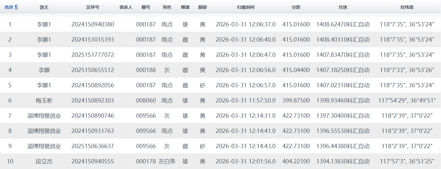 3月31日,山东淄博市信鸽协会2026年春季400公里在安徽亳州鸣枪开笼。三千多羽赛鸽参赛。最终,鸽友李娜凭借绝对实力,麾下赛将不仅摘得冠军,更是一口气包揽了前五名。一起来看详细情况: