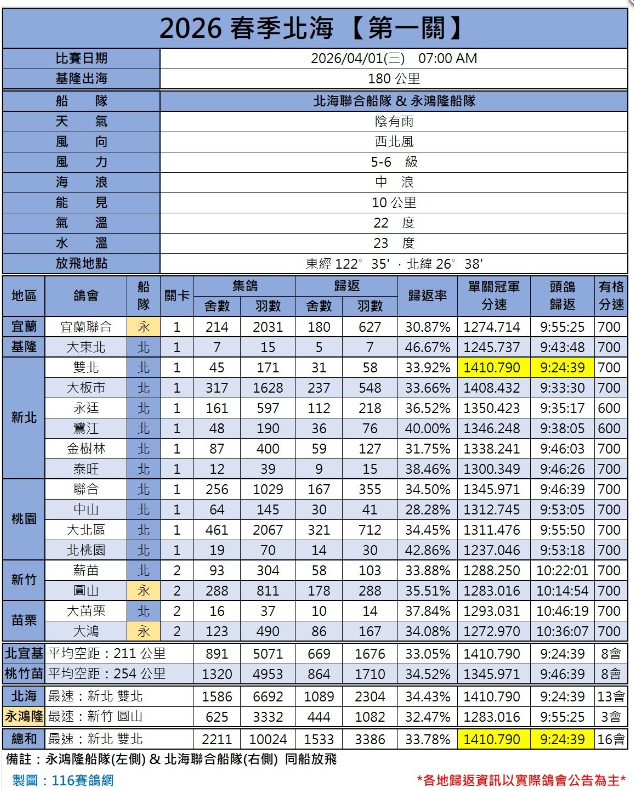 2026年台湾北海春季赛,难度不小:首场资格赛就遭遇“滑铁卢”丢鸽三万羽。4月1日结束一关比拼,归巢率也不足四成,仅三千羽赛鸽成功归返,淘汰率相当之高。究其原因,天气情况是一座绕不开的大山。接下来请看详细赛况。