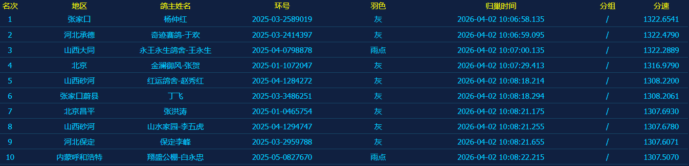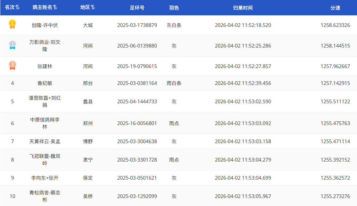 当天中午11时57分,第一梯队赛鸽如离弦之箭般高速归来。经过激烈的角逐,天津浩翔公棚-梁月的一羽足环号为02-0003184的灰鸽率先冲入鸽棚,以1799.5130米/分的惊人分速斩获冠军,展现了超凡的爆发力。沧州·雄起-刘景洋的03-1354347灰鸽紧随其后,以1785.3910米/分的分速锁定亚军。王洪明选送的04-1226675灰鸽则以1779.4241米/分的分速荣获季军。截至4月2日早9时30分,本场决赛共归巢861羽,归巢率为23.38%。点击查看直播