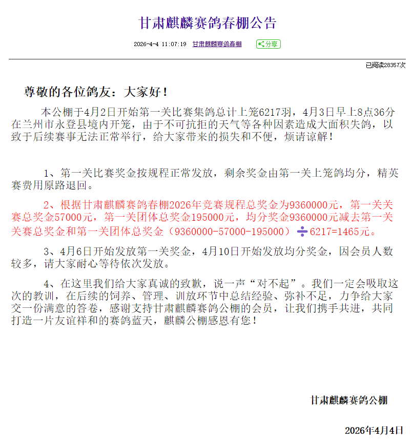 4月4日,公棚发公告宣布停赛,称“由于不可抗拒的天气等各种因素造成大面积失鸽,以致于后续赛事无法正常举行……第一关比赛奖金按规程正常发放,剩余奖金由第一关上笼鸽均分,精英赛费用原路退回。”