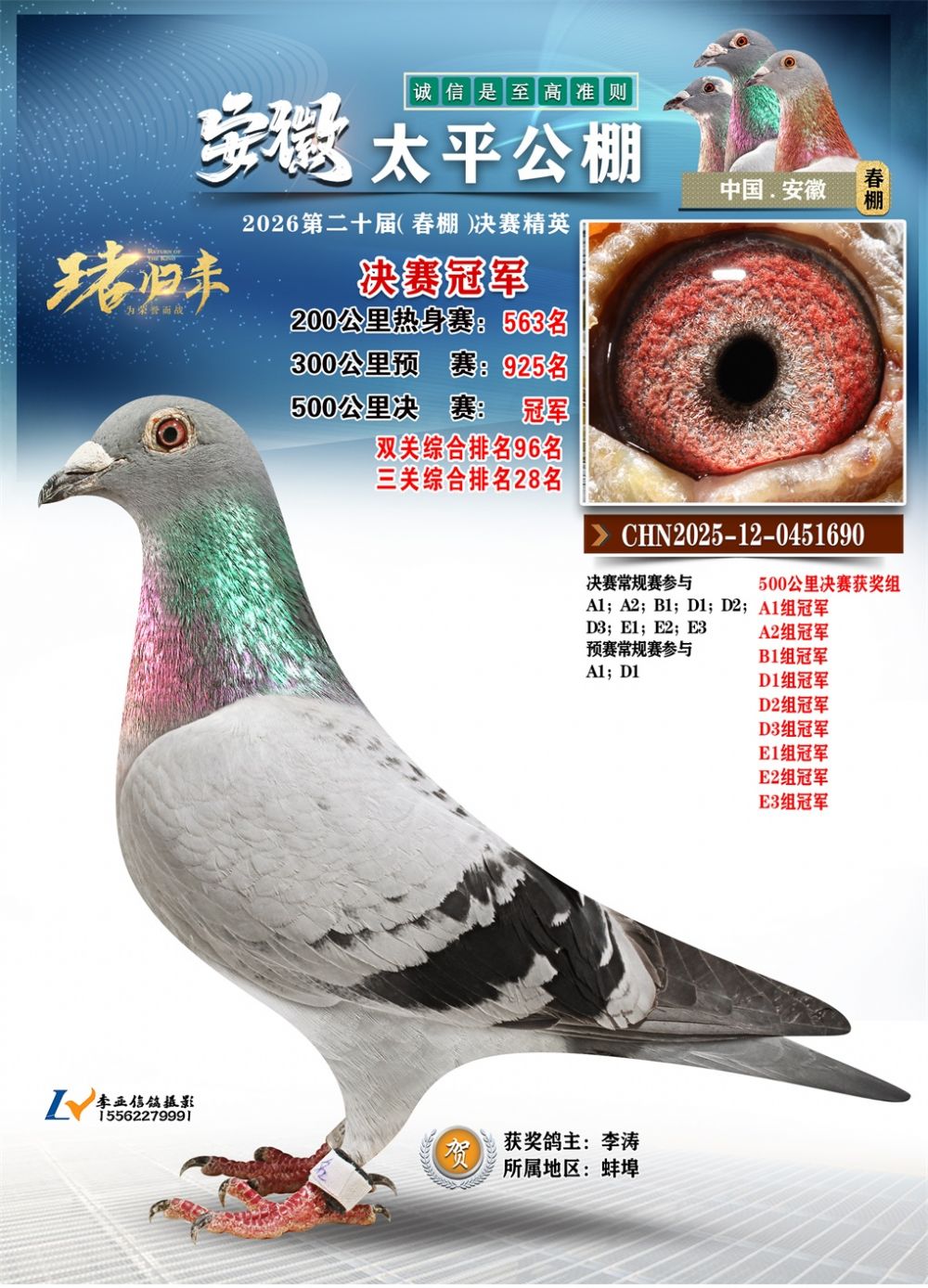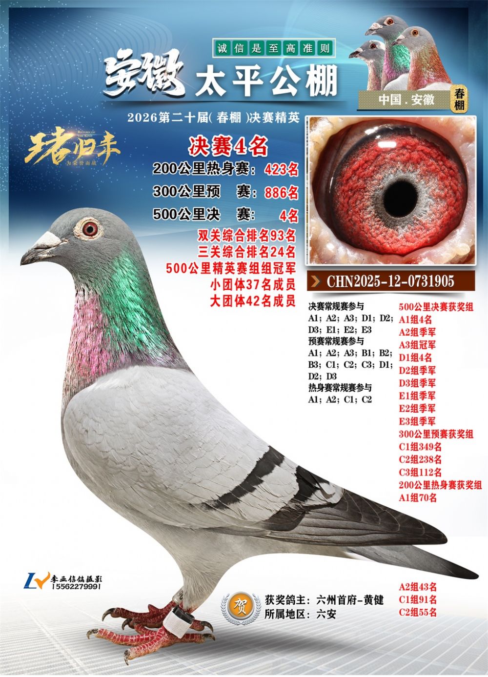 决赛场上群鸽逐鹿,实力精英奋战到底。来自李涛鸽友麾下2025-12-0451690雨点赛鸽,以1162.1568米/分的成绩荣膺决赛冠军,同时此鸽还拿下三关鸽王28名。而三关鸽王桂冠,则被朱光旭鸽友名下的2025-10-1146523灰鸽强势揽获,此鸽连战连捷,分获首关64名、二关125名、三关109名,不愧为一羽实战强鸽。