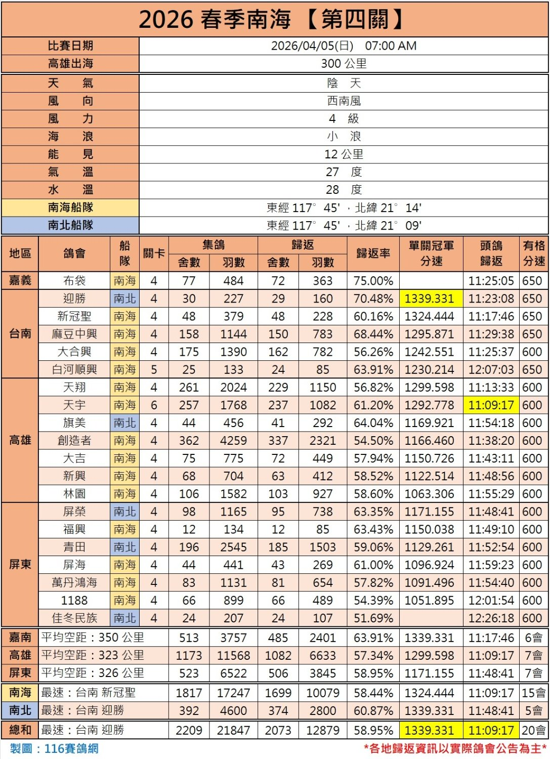 南海春赛第四关共集结2209个鸽舍、21847羽赛鸽,于高雄港出海300公里处放飞。司放地天气阴沉,西南风4级,海面小浪翻涌,气温27℃,水温28℃,对赛鸽的定向与耐力构成不小考验。