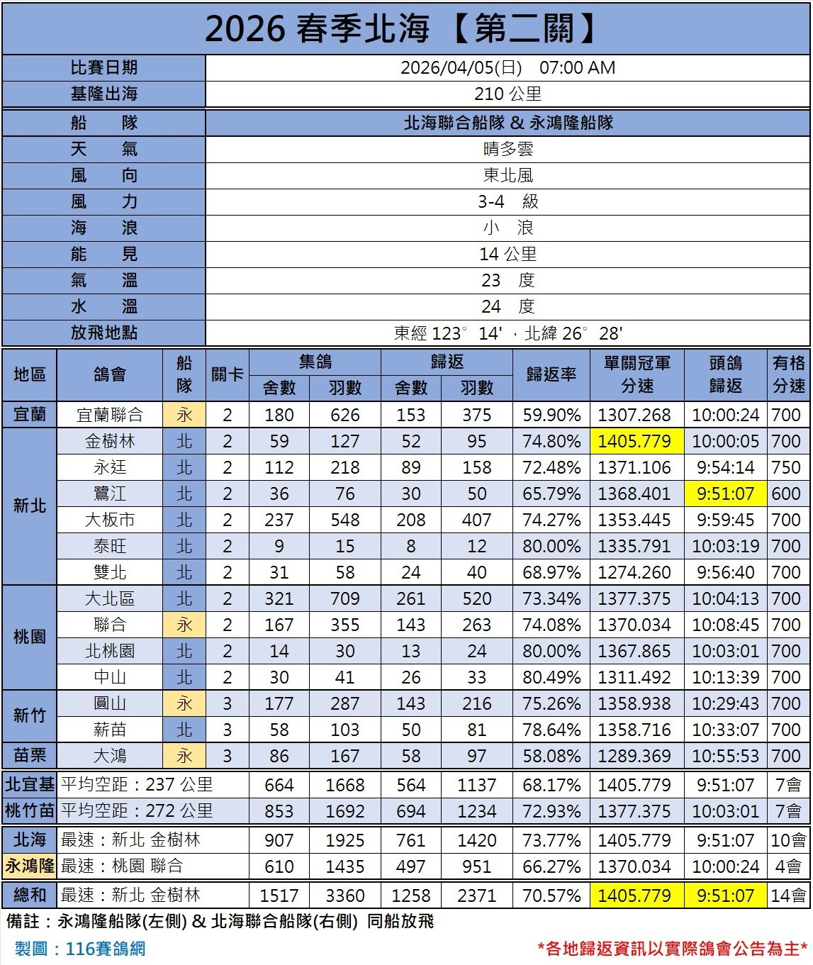 北海第二关共集鸽1517舍、3360羽赛鸽,于基隆港出海210公里处准时开笼。司放地天气晴转多云,东北风3-4级,小浪轻拍,气温23℃,水温24℃。