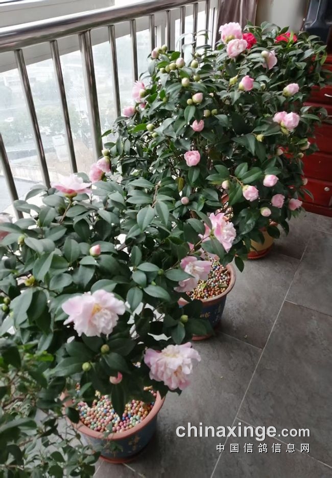 花到家就忙着换盆,事毕将这些茶花树都置于大客厅外的大阳台上。阳台长宽3800×1600mm,换盆后的山茶花树一字长蛇临外边铺陈,稍有点挤。浇好水等了几天,还好它们既没掉叶、新芽也未萎缩,它们都活了下来。过了二十多天花蕾前后绽放,清香可闻,此花不愧为‘香妃’。此香妃非彼香妃,这又凭空增添了一些遐想……