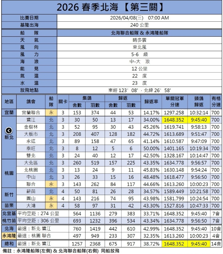4月8日清晨7点,台湾北海春季赛第三关在基隆港外240公里处开笼。本次司放由永鸿隆船队与北海联合船队联合执行,多家鸽会共集结1257家鸽舍、2368羽精英赛鸽参与角逐。当天天气晴间多云,海面能见度良好,气温22℃,水温23℃,东北风5-6级。