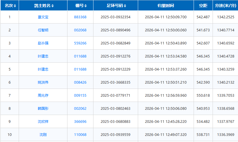 中午12:50,赛场打破沉寂,首批赛鸽陆续归巢。最终,来自葛文宝2025-03-0932354的赛鸽,以1342.2525米/分的分速率先冲线,拿下本关冠军。任智明的2025-03-0890496赛鸽随后斩获亚军,平均分速1340.7714米/分;季军则由赵永强的2025-03-0682849赛鸽获得,平均分速为1340.6592米/分。