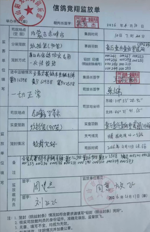 4月11日清晨06:06,备受瞩目的唐山市信鸽协会&唐山阳光五关联翔赛(第二关)在内蒙古罕苏木正式拉开战幕。本次共集鸽11102羽,实际空距553.839公里。司放当日,天空晴朗,4-5级的西北风劲吹。