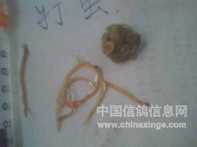 1月19日效果观察:为检验效果及追踪观察疗效,专门于中午清扫鸽粪,粪检显示:发现死虫两只,有2厘米长,从栖架显示是一羽新引入的西翁,在原来的鸽舍卫生条件不好,管理也很不到位,就是投资鸽子肯花钱。