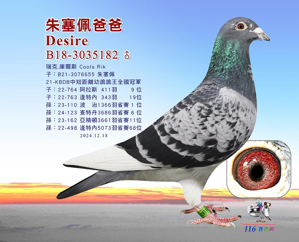 “朱塞佩” 的父亲“渴望号”,本身就是一羽功勋种鸽,不仅作出“朱塞佩”这羽鸽王冠军,其孙代又在波治23846羽赛事中斩获5位。往上追溯,“渴望号”是“尼克”的直孙,也是“克里斯塔”与亚历山大473的外孙。