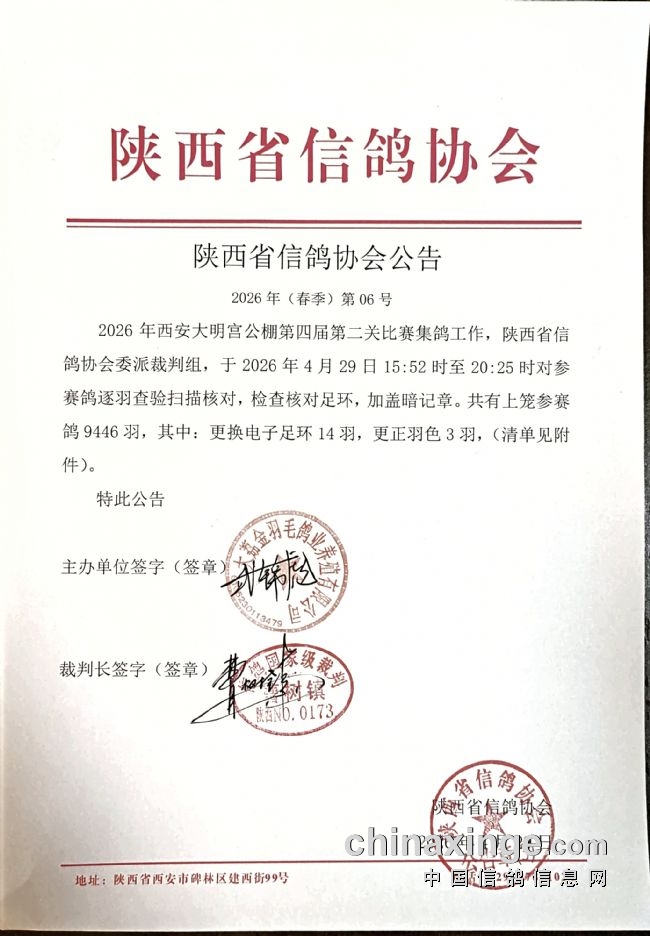 本场,第二关比赛集鸽继续由陕西信鸽协会执裁,鸽友代表和信鸽媒体监督,网络手机视频直播,全部环节公开透明。从下午15:52分开始至20:25分结束,历时6小时33分,经过裁判员逐羽检查参赛鸽足环,核对电子环信息,检查鸽子状况,贴密封条等环节。总计集鸽9446羽,这个第二关赛集鸽羽数,是陕西春棚第二关赛集鸽最高记录,同时与自家比,比去年第二关集鸽6079羽多了3367羽,取得了长足进步,尽显实力。