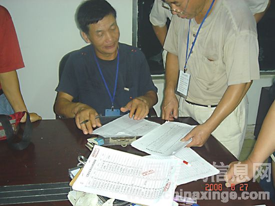 裁判员们认真统计核对验棚数据并在验棚记录表上签名认证