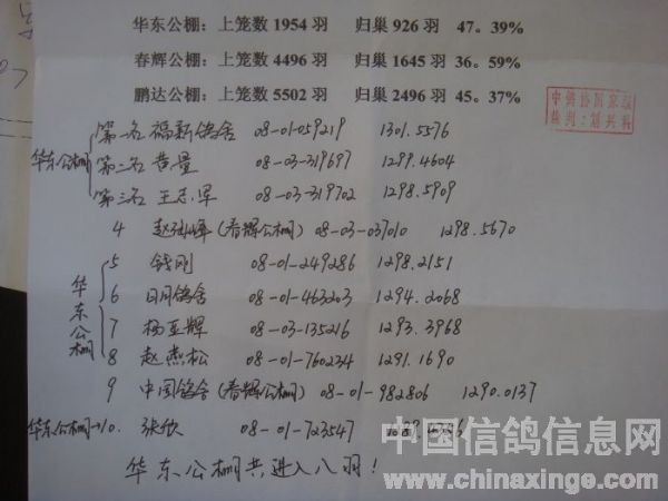 本次东燕郊三大公棚联翔赛圆满结束,其中华东公棚上笼1954羽,归巢926羽,归巢率为47.39%;春辉公棚上笼4496羽,归巢1645羽,归巢率为36.59%;鹏达公棚上笼5502羽,归巢2496羽,归巢率为45.37%。以下是本次三大公棚联翔赛鸽王前十名: