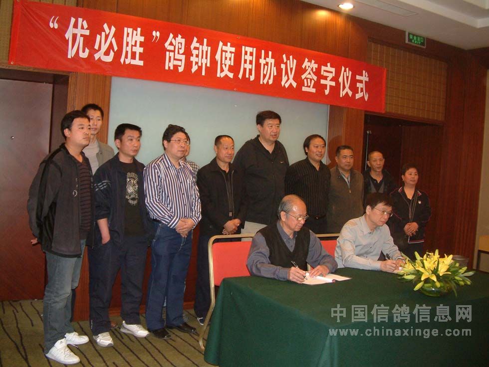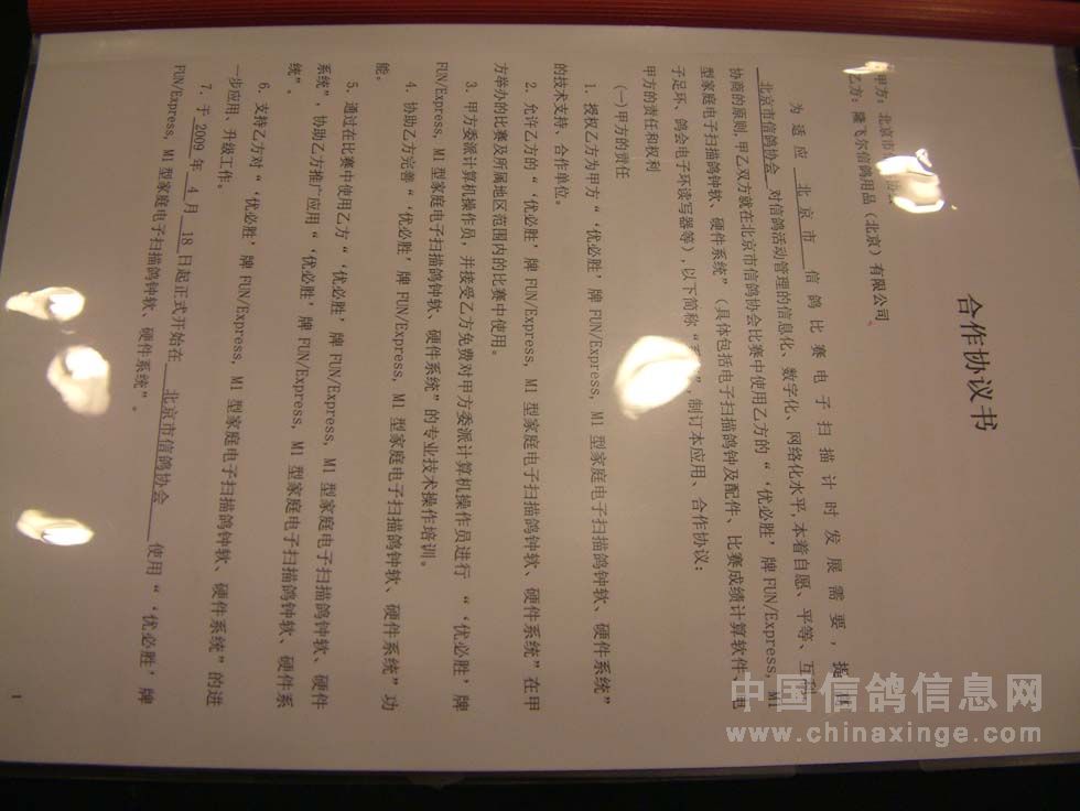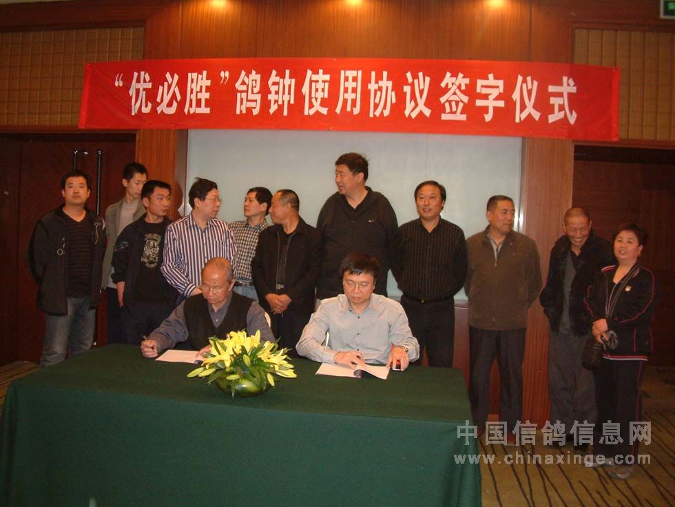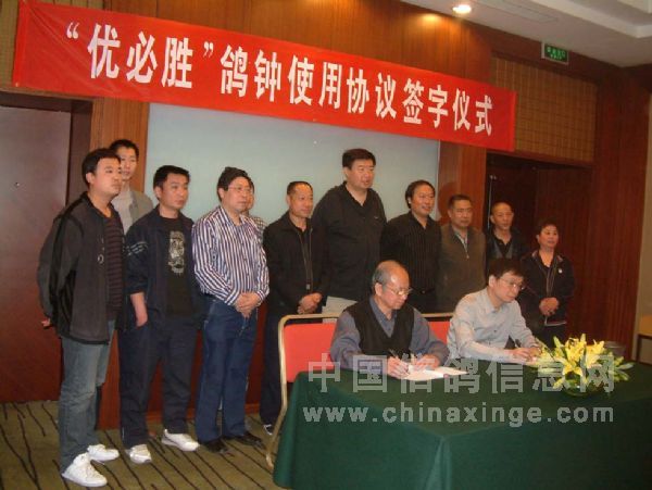 今天中午,北京市鸽协与德国隆飞尔信鸽用品(北京)有限公司(以下简称德国隆飞尔北京公司)签约使用“优必胜”电子扫描鸽钟。笔者应邀拍摄了现场情景。签约仪式在一家高档酒店举行。出席签约的有市鸽协领导人林先生、闵先生、姚先生以及隆飞尔公司的黄廷彰先生,还有赛鸽天地的杨先生和黄先生,以及海淀鸽协、丰台鸽协、昌平鸽协的负责人。