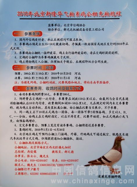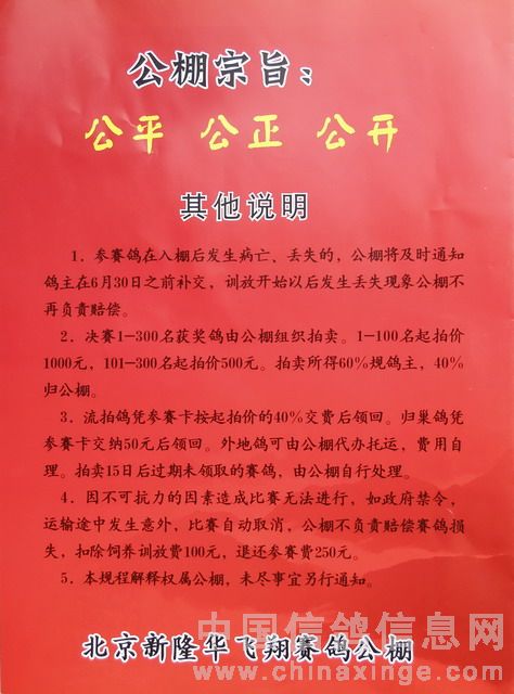 新建华公棚位于北京市海淀区西北旺镇,是在原建华公棚的基础上重新组建的新公棚。公棚的新规则充分体现了人性化,参赛收费走的是低端收费标准,每羽参赛鸽收取参赛费300元,饲料费50元。参赛鸽放飞150公里后收取参赛费,预赛未上笼的赛鸽退还参赛费。参赛鸽5—150公里训放不少于12次。收鸽时间截至6月30日。