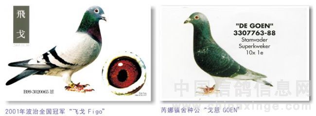 许多赛鸽强国的真正强豪,在国内反而是名不见经传,而在赛鸽强国中却是一鸽难求。他们的优良品系纷纷被熟知内情的名家高手争相引进,而我们却因讯息的不完整,信息传递缓慢,只能一再浪费大把金钱去寻求二流品系,或者等到金矿被挖的已经差不多了,再去开采。长久下去,又如何谈要超越世界级名家呢?!本文就要向各位读者介绍欧洲最新掘起,也最当红的鸽系.2001年比利时波治国家赛12266羽全国冠军“ 飞戈Figo”,环号B1999-3020065,本身除了入赏波治全国冠军以外,同年还入赏了比利时K.B.D.B.中距离鸽王全国季军。而在此之前“飞戈Figo”还连续入赏了9次冠军。