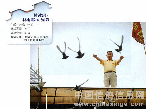 赖氏兄弟外,中部还有一对强豪兄弟林沐惠、林雨露。林沐惠是嘉义县鹿草“乡长”,和小两岁的弟弟林雨露,从国中开始养鸽。养鸽子,和林雨露国中一年级的国文老师有关。林雨露国一时,有一天上课,以养鸽子为兴趣的国文老师突然问起这群升学班的学生:“有没有人想养鸽子?”同学中,只有林雨露举手。从此,林雨露每次下课,都和国文老师聊鸽经,一直到现在,四十年来,还和这位国文老师经常往来。林沐惠说,那时候,和弟弟两人经常骑脚踏车,到十二公里远的国文老师家,帮忙清理鸽舍;后来,老师给他们兄弟比较好的鸽子,也开始参加比赛,培养出了兴趣和专业。