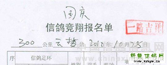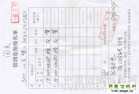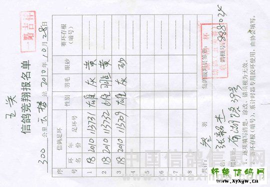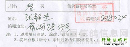 这里要说的張毅杰“国庆杯” 和“五关赛第二关” 同一场等距离、同集鸽时间和地点、同司放时间的比赛,为什張某人两份竞翔单,所盖的印章有所不同。国庆杯竞翔单与五关赛笫二关竞翔单同在一个窗口交费施章,同一个人盖章竞盖出两种内容的印章,这两枚章是真是假?是先填单后盖章还是先举盖章后填表?这些不令人生疑么?莫不又是在市鸽协作弊的翻版?(详见竞翔单)