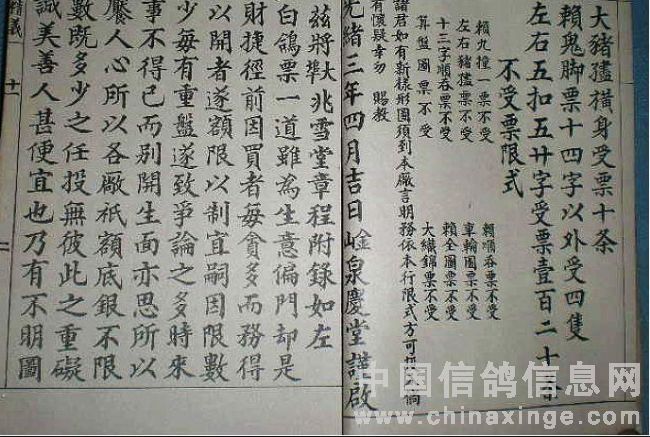 传闻白鸽票产生于道光年间,另有一说是在光绪末年。那时维新派竭力主张以新学取代旧时科举,朝廷争议中维新派渐占上风,若科举一旦取消,围姓也就失去存在的根基。在围姓生死存亡关头,善于随机应变的广东赌商就以白鸽票作为替代围姓的赌式,当时的白鸽票有个别名叫“小围姓”。但白鸽票是地地道道的中国彩票,它与围姓博戏相去甚远,接近于铺票、山票,与山票的戏法最为接近。白鸽票也是圈字,只是可供圈画的字较少,仅80个字,故有“八十字有奖义会”之称。字源与山票一样,也是来源于《幼学千字文》,从“天地玄黄”到“鸟官人皇”。投买者圈10个字为一票,开彩开出20个有效字,以中字多少决定是否中彩及彩金等级。