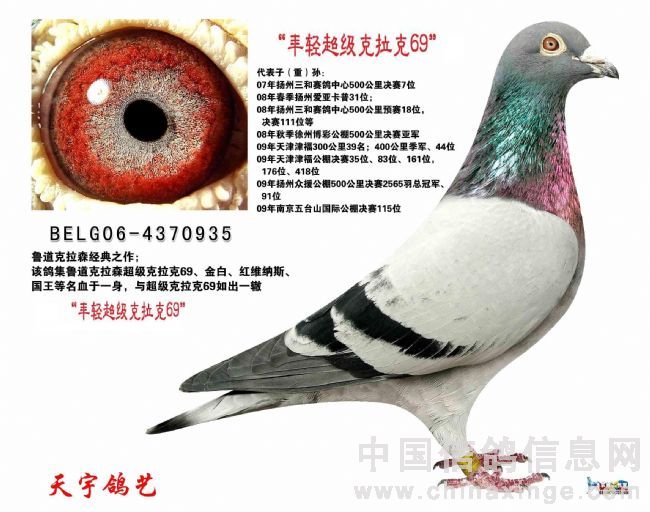 1、父系:NL07-3762955,扬州三和公棚500公里决赛255位,第二天归巢;皮埃尔瓦森挚友Peeters/Huybregts参赛,直系获得2006年中荣百万欧元预赛冠军,决赛4位、8位;来自考夫曼血统,该血系于荷兰本土赛绩非凡,不予赘述。