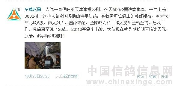在下面这段热闹的日子里,我将陪伴着大家,尽可能在“第一时间”提供现场的信息和图片给大家浏览,昨天还特意开通了新浪微博“华尊赵勇”方便手机上网的鸽友随时观看140字内的短文。