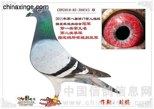 2010年4月2日天津职工信鸽协会400公里大奖赛亚军、区冠军、57名,参赛2308羽。