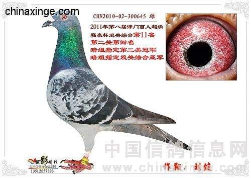 2011年5月24日天津市南翔俱乐部第八届津门百人超级强豪杯第一关400公里赛7、8、9、12名,第一关暗组指定获第2名,指定鸽获C5组季军、B1组季军、B2组亚军、B5组冠军、A1组冠军、B2二只组冠军。