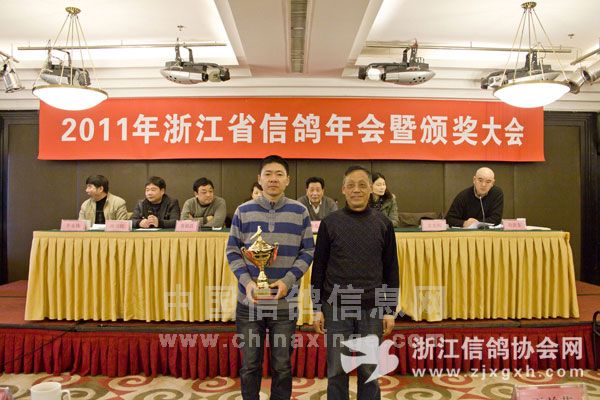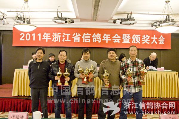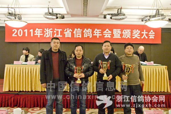 浙江省信鸽协会副主席、温州鸽会主席陈美旺(右一)、向获将单位杭州市和湖州市颁奖。