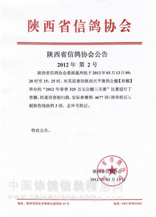 最终由省鸽会发布了查棚公告,经过全体裁判员对参赛鸽子的电子扫描和逐羽检查,最终实际健康的参赛鸽子有4677羽,剔除伤残鸽子3羽,详见查棚清单:陕西天平(春棚)首届三关赛查棚清单。