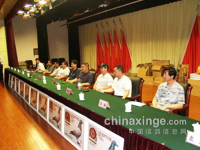 主席台前摆放着金光灿灿的奖杯和优胜鸽彩色照片
