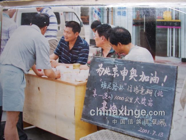 2001年的夏天,全国申奥运动如火如荼,到达关键时刻。作为一个群众团体,很想融入这个盛大的活动,倾情表达我们鸽友支持申奥的热情。7月12日,偶然的机遇,昆山商厦与我们鸽协不谋而合,达成了支持北京申奥,鼎力资助北京放飞1000公里“班尼路”杯活动的合作协议。