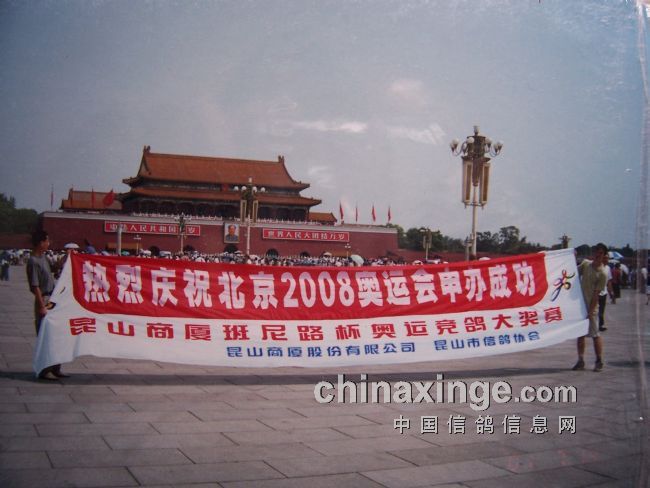 看着群鸽盘绕了一大圈消失在天际,意犹未尽的“先行部队”,甩下我们的司放员,又马不停蹄转赶到天安门广场,迅速打开了赛事活动“祝贺北京申奥成功”的横幅,摄下了精彩的瞬间。哈,他们“鸽外人士”确实有点商业行为,但行动可以理解。待北京鸽协监放人员赶到,事情已经基本结束,让北京鸽友白白起早,苦等了许久。而周广达先生等鸽友没有过多计较,仍热情友好地邀请我们鸽友访问了北京鸽协,并安排了中午便饭,让我们两位司放员着实感受了“天下鸽友一家亲”的温暖。对此,我们昆山鸽协深感歉意,事后,笔者代表鸽会组织专门写信去北京,衷心感谢北京鸽协、鸽友对我们江苏鸽友来京放飞活动的大力支持。同时又为联系脱节,监放未成,先行人员隔行如隔山,在放飞过程中难免产生的理解不一、言行不慎,表示深深歉意,恳望理解万岁,并提出向北京鸽界老大哥学习!