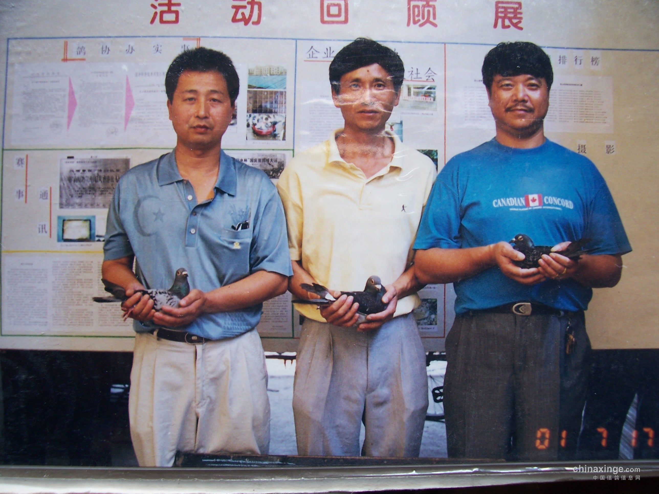 这次“班尼路”杯赛冠、亚、季军得主分别为陈俊宝(照片中)、夏继国(照片左)、倪永兴三位会员,鸽协专门为他们照相留念。喜庆之余,合作双方当天即举办了庆祝颁奖晚会,记得那天商厦共享空间大厅里人头攒动,银屏里一遍遍播放着北京申奥成功欢庆和赛鸽放飞场面的录像,政府体育局有关领导也出席了晚会讲话。现场气氛热烈,群情振奋,社会反响空前,我们鸽友个个都像凯旋而归的勇士——特别的长脸。