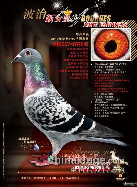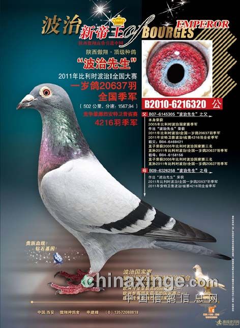 1. 从血统上看,它们都来源于比利时,在同一波治赛场上,雄鸽夺得了2万余羽三名,雌鸽夺得3万余羽八名。同一级别的大奖鸽交配,祈望后代能保持同一距离的优势。在引进父母时也考虑到了其上代鸽,在500公里赛程中的遗传延续性。冠军的父亲和祖父本身都是比利时波治国家赛季军;外祖父是世界中距离名鸽菲戈的直子,上代有多羽中距离鸽王和冠军的王血。