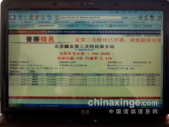 中午14:02分,赛鸽报到系统传来赛鸽报到信息:10012鸽棚潘邵祥先生的三羽赛鸽赛12-1015240、12-1015251、12-1015254报到,空距555.587公里,分速分别为:1,373.0402米/分、1,368.8792米/分、1,368.7499米/分,分别获得冠、亚、季军。报到消息传来令人感到兴奋,每分钟一千三百多米的分速,令人满意。