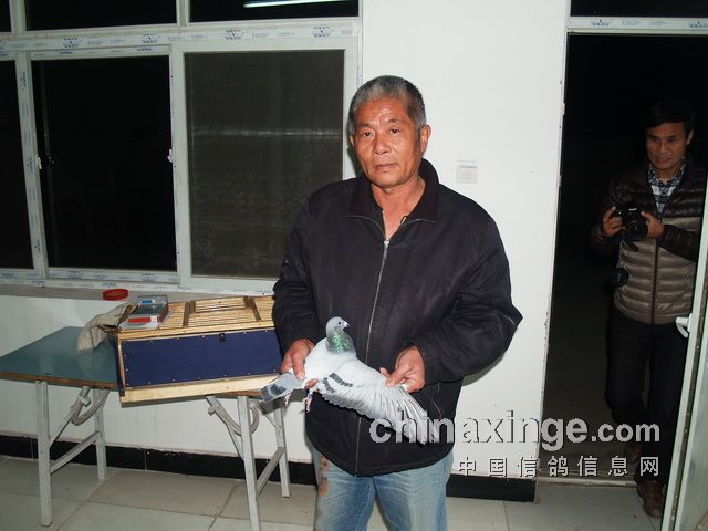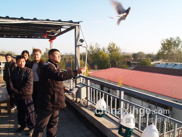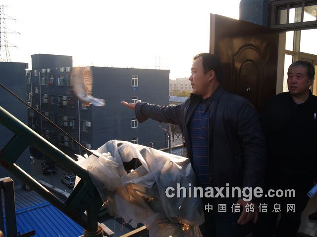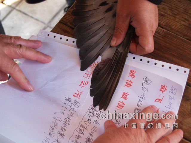 我们登上楼顶,教练抓出前三名归巢鸽。执行裁判王志雄先生细心逐一核对暗章、羽色、眼砂,然后放飞,待获奖鸽进棚后,再次抓出验证,确保赛鸽的真实性,以防假冒和A、B棚。