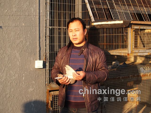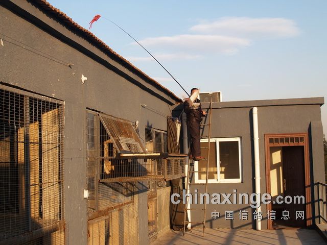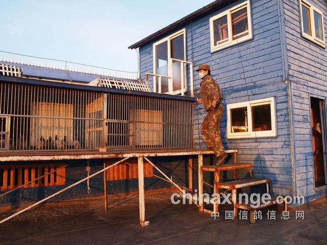 第三家是李普先生鸽舍。走进李普家附近,远远就可以看到楼顶的鸽舍非常漂亮,犹如一处空中楼阁令养鸽者神往!李先生的鸽舍分前后两排,前排是一所标准的专业木质鸽舍,后排是一所很具规模的传统模式的鸽舍,底层腾空,晒笼面积很大,一眼看来是一所种鸽舍的结构。鸽舍东面底层是观察瞭望室和储藏间,二层是瞭望室和饲养居住室。据悉,李普先生忙于商务,鸽舍由其太太和一名饲养员打理。一来到楼顶,李太太就抱怨开了,说她的鸽子归巢后十来分钟都不进棚,赶都赶不进去,影响很长的报到时间。