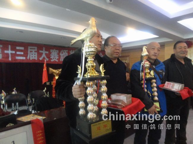 马鹰宣读了本届竞赛获得前十名单鸽、鸽王、大小团体、汽车大奖赛冠军等优胜鸽主名单。获得单鸽前十名的鸽主分别为:温莎鸽舍、严景宇、马建国、石少军、东西南北鸽舍、雨林鸽舍、张宁平、鸿伟鸽业、陈文彬、高伟。获得鸽王前三名的鸽主为:甘肃省熙园鸽舍,获奖名次预赛87名、决赛18名;亚军称泽元,预赛名次25名、决赛40名;季军内蒙古乌海市李晴峰,预赛64名、决赛46名。获得大团体前三名的是:冠军陈宁进奖6羽,亚军袁世友进奖5羽,季军宝成鸽舍进奖4羽。获得小团体前三名的是:李江龙、袁世友、保成鸽舍。获得汽车大奖赛AB组冠军的是:内蒙古李靖峰、陕西省高伟。康健、吕新平、李建功、马少清等领导为优胜鸽主颁发了奖金和奖杯。冠军鸽主温莎鸽舍和汽车大奖赛二位冠军鸽主,分别为宁夏赛鸽公棚赠送了书法匾牌和吉祥宝鼎。