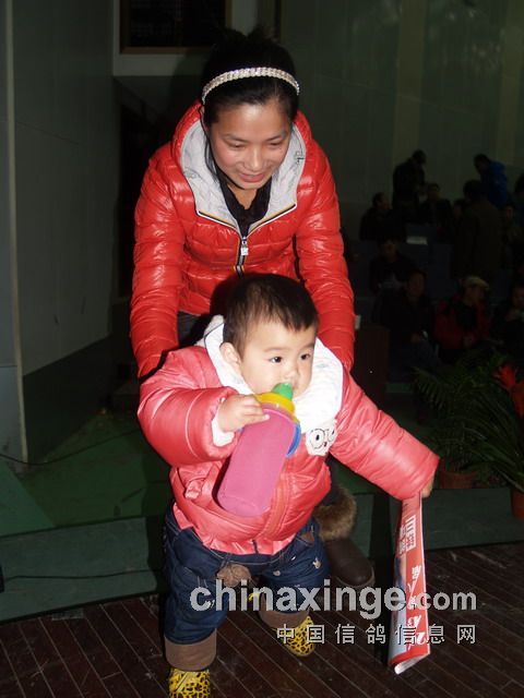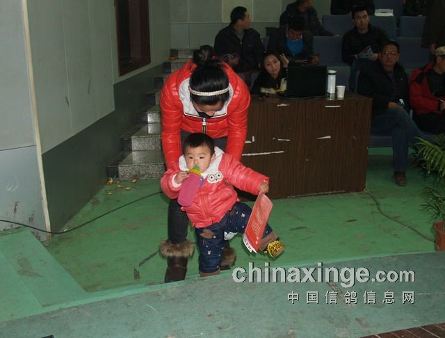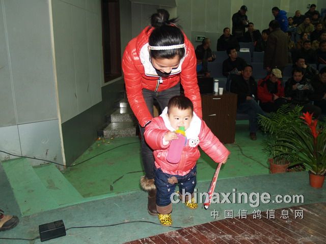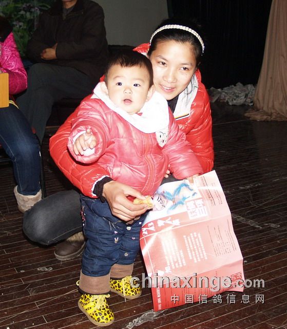 一个婴儿手里拿着一张“铁鸽三项”2013年竞赛规程,在母亲的呵护下一步一步迈向踏步台阶,走向主席台,这个画面马上在我的脑海中预示着一个新生力量的诞生,预示着信鸽事业的不断强大和发展,让我们对未来充满希望。于是,我急忙拍下了这组镜头。