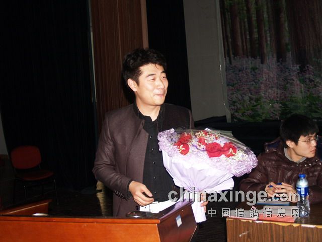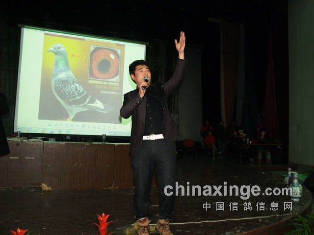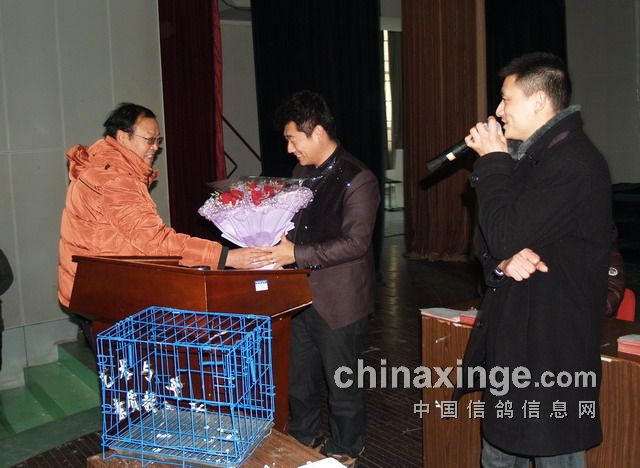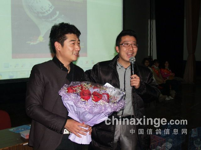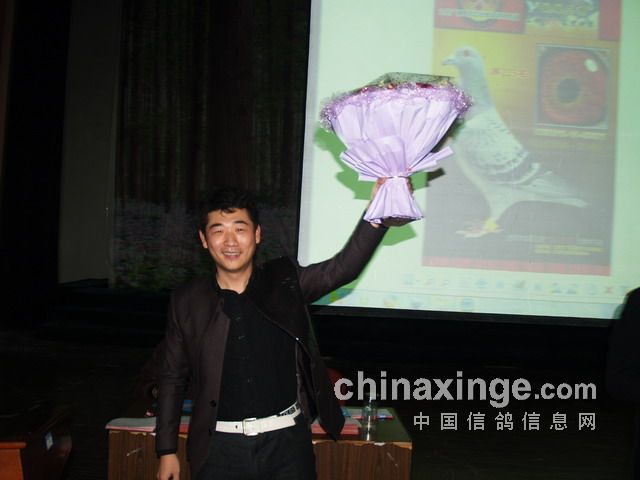 刘子锐先生挥舞鲜花向台下的鸽友表示谢意