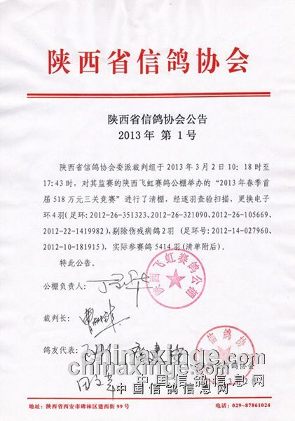 本次查棚工作从上午10时到下午18时结束,查棚结果是:实际存棚的健康鸽子5414羽,其中,更换电子足环4羽,伤残鸽子2羽,并以省信鸽协会名义发布查棚公告,同时,在网上公布了存棚鸽子名单。