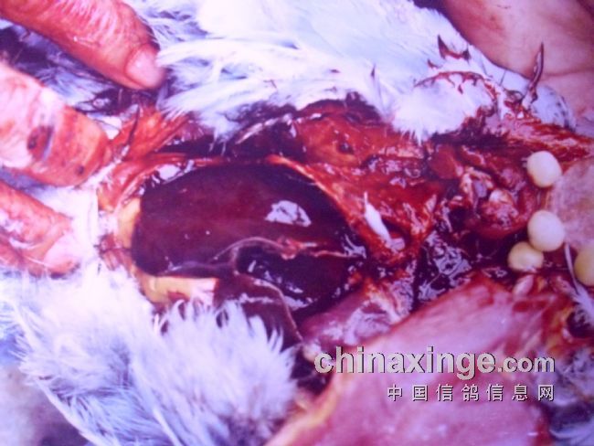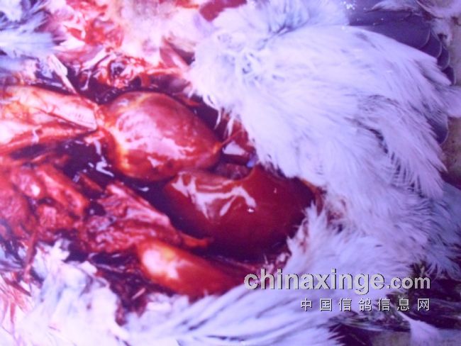 当时用了鸟疫(巴拉米哥)和沙门氏菌两种药,一点效果都没有,朋友说这是什么原因?作者当时让公棚的医生小张解剖了一羽死亡病鸽,朋友们可以清楚地看出: