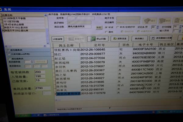 陕西省信鸽协会5月17日晚上对天平春棚第一关进行集鸽,经裁判员扫描核实,共计参赛鸽2790羽。按照比赛规程,将奖励前200名,前3名各设奖杯一樽,奖金分配:冠军10000元,亚军8000元,季军5000元,4-200名各2000元。