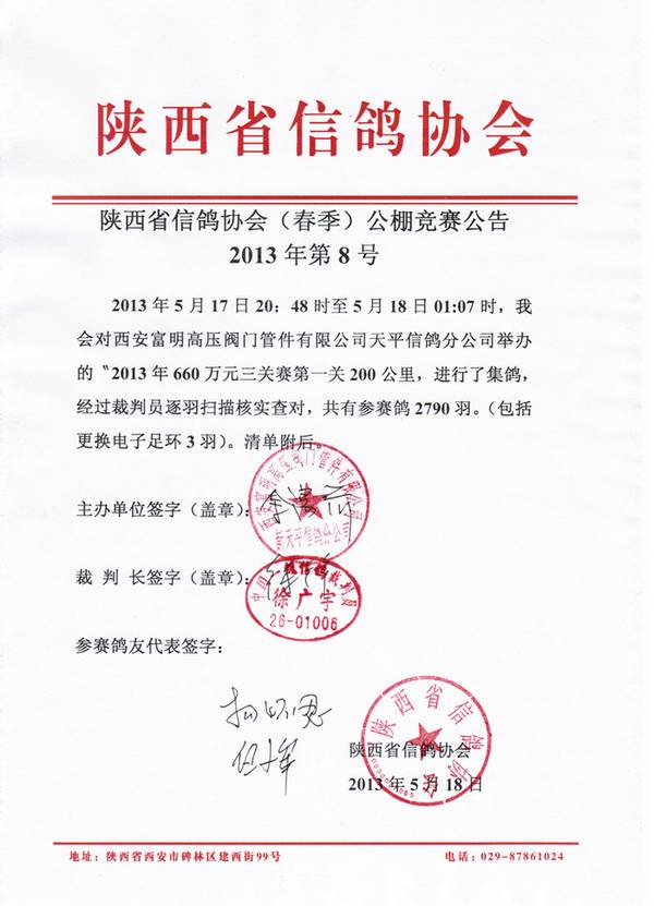陕西天平春棚第一关200公里比赛于2013年5月18日07:40开笼,司放地经纬度是110°22′37.3″,35°20′34.6″,实测空距183.9公里。