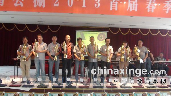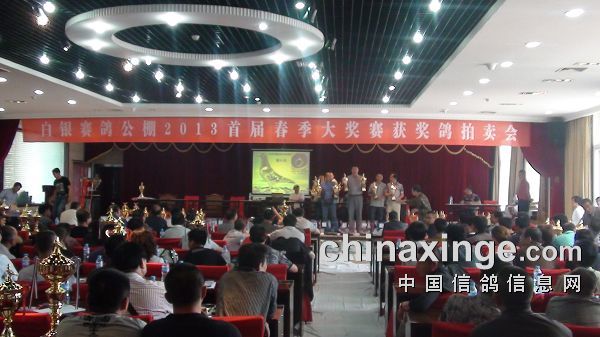 甘肃白银赛鸽公棚首届春棚拍卖会,于2013年5月26日早上8:00在白银市万盛大酒店举行。上午8:00-8:30进行获奖鸽展示,8:30-9:00颁奖仪式,9:00开始拍卖,竞拍底价:100名以后300元起拍,100名-11名500元起拍,10名-冠军2000元起拍,双关鸽王1000元起拍。 甘肃白银赛鸽公棚首届春棚拍卖会花絮