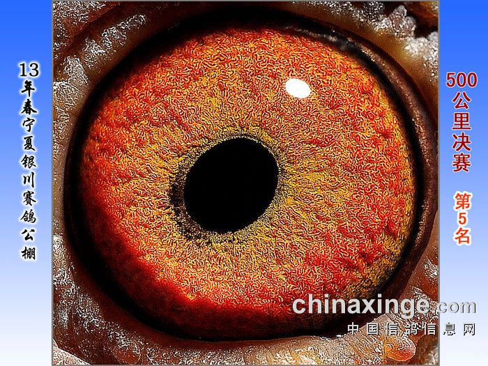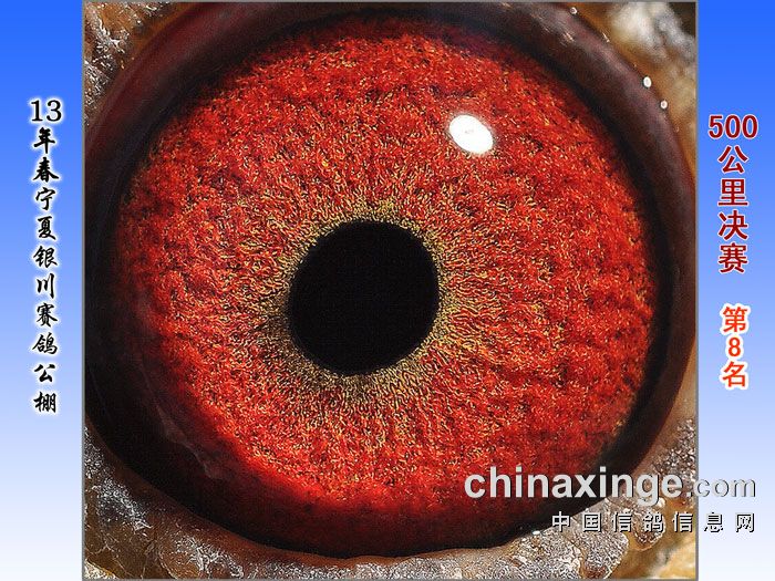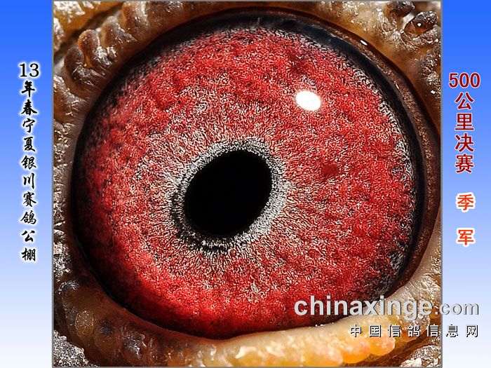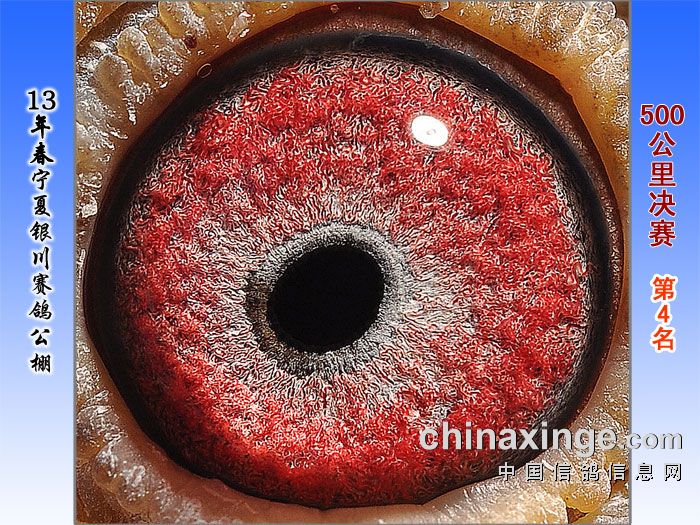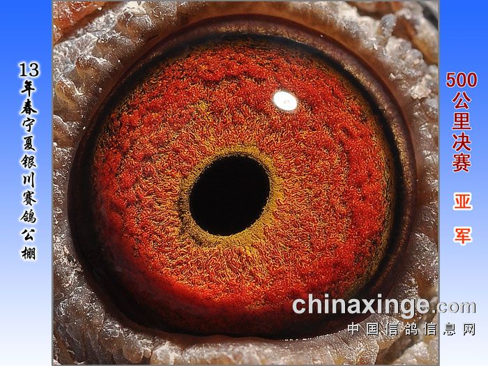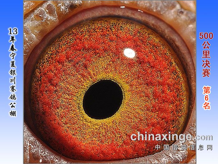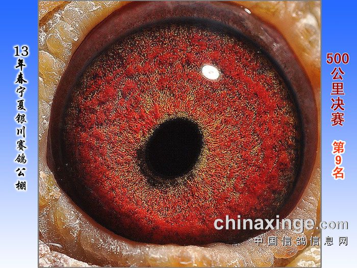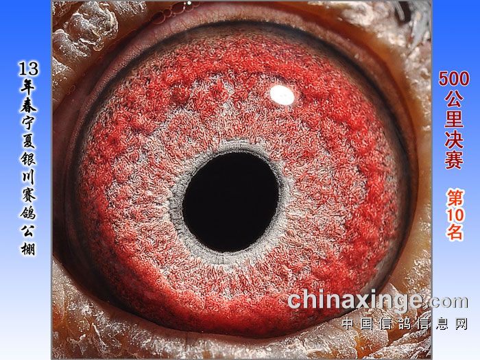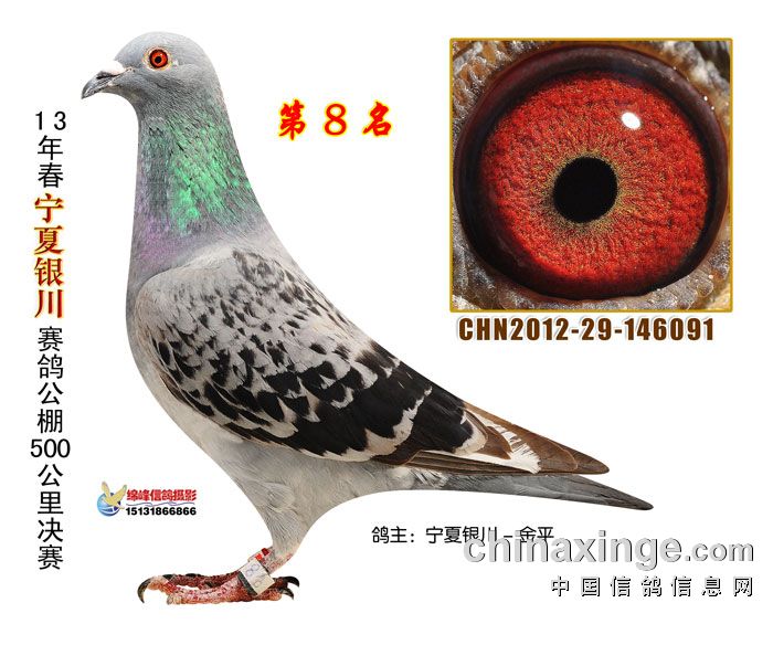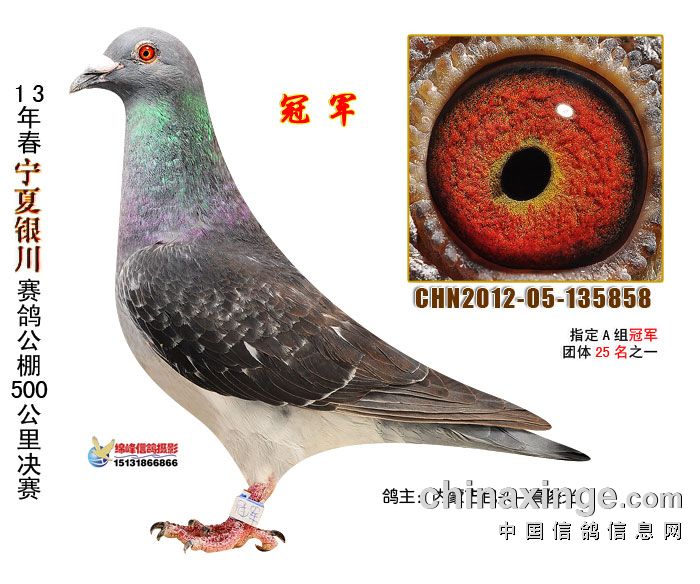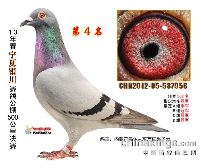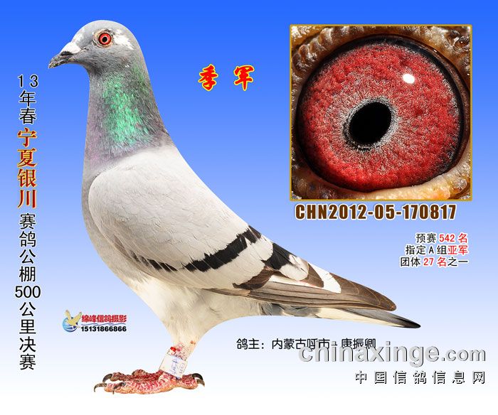 宁夏银川赛鸽公棚500公里决赛集鸽2042羽,于6月6日早上05:30在陕西高陵北开笼,放飞地天气:多云。当天下午13点11分22秒,第一羽赛鸽归巢扫描,是内蒙古包头高俊光鸽2012-15-135858雨点赛鸽,分速1085米/分。亚军是宁夏银川的李玉山,赛鸽分速1082米/分,季军是内蒙古呼市的康振卿,赛鸽分速1081.62米/分。当天共计归巢180羽,至次日中午11点33分,比赛前400名全部报满。以下是比赛前十名成绩与照片欣赏: