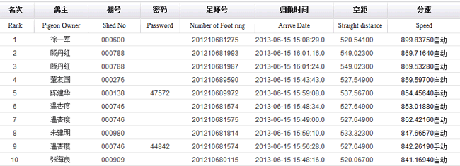 截至晚上19点30分,无锡市报到100多羽赛鸽,以下是前十名直播成绩: